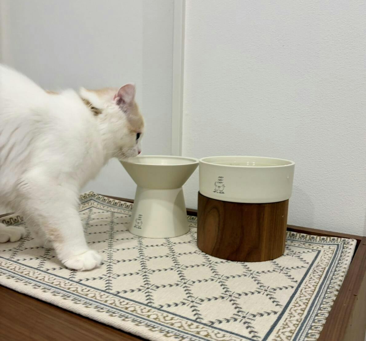 The base products are "CHALICE" and "HM BOWL" - both of which are designed to be the right height for cats, with a shape that puts less strain on the neck and joints. The smooth feel of porcelain on the tongue and the warmth of the solid wood base bring comfort to your daily dining table.