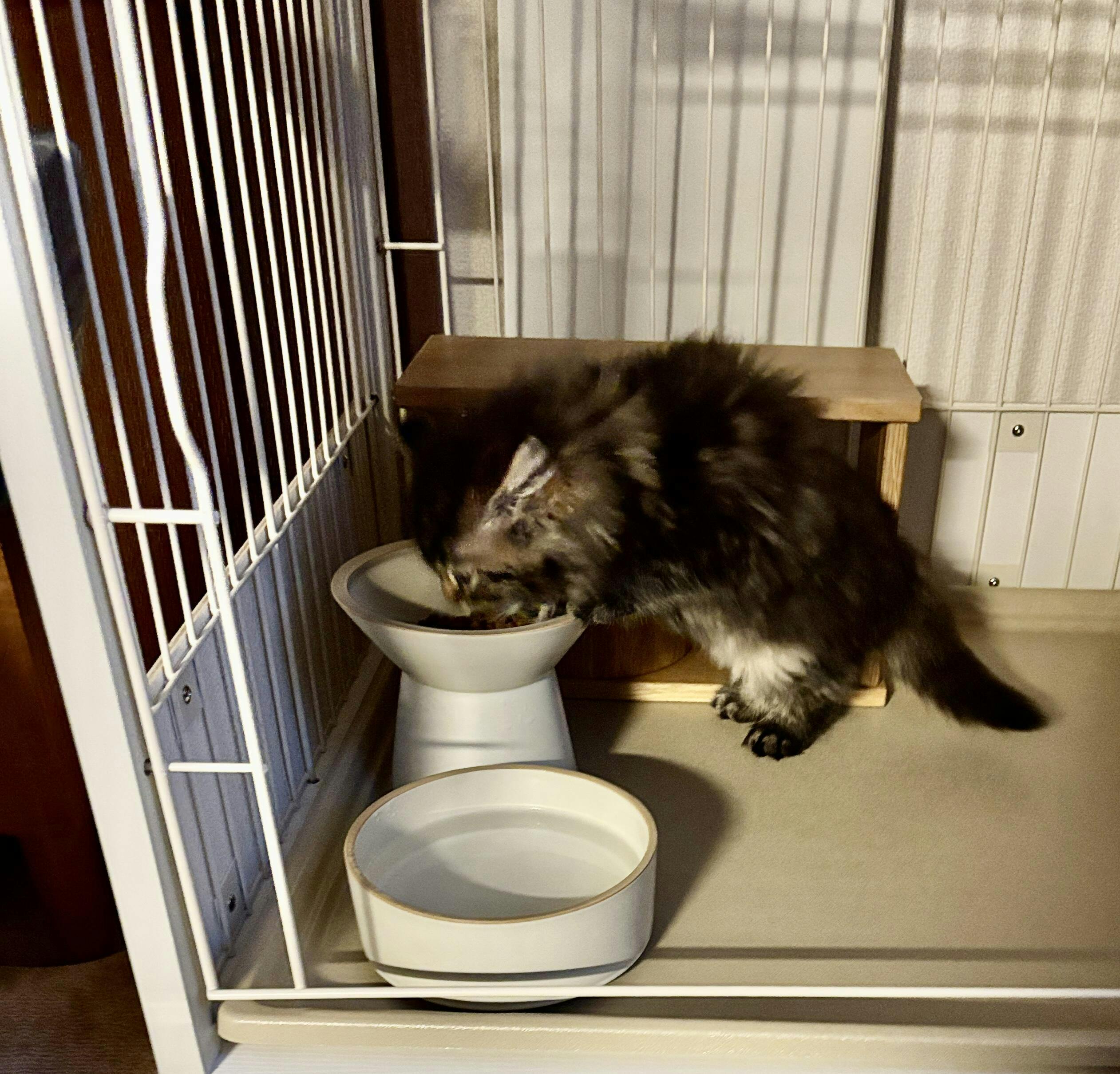 A cat buries its face in its mouth as it eats and drinks water. Each of these small actions becomes a part of everyday life.